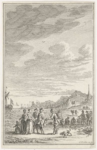 Curator: This print by Simon Fokke, made between 1782 and 1784, depicts the execution of Johan van Oldenbarnevelt in 1619. It’s currently held at the Rijksmuseum. Editor: Goodness, what a stark scene. The stark black and white engraving really intensifies the grim feeling, doesn’t it? It's like all the light has been sucked out. Curator: Indeed. The use of line is quite deliberate. Note how Fokke employs dense, cross-hatched lines to create shadow, thereby enhancing the drama. It is a very Baroque treatment of a grim historical moment. Editor: Baroque, yes, but also... well, theatrical, I think. Everyone seems posed, the guards arranged almost like a chorus. Except the poor soul kneeling of course. I feel like I am viewing the action on stage, far more than some genuine recording. What do you feel about its impact? Curator: The staging is key. The high vantage point offers a detached view, as if history is unfolding before us in a meticulously crafted composition. The backdrop of the cityscape, complete with a towering church spire, lends an air of solemnity and permanence. Editor: I like that solemn permanence. It contrasts nicely with the chaotic energy right in the centre, that poor man, poised to be beheaded as if frozen, while all about him is formal order. What I think I find interesting is what an eighteenth century artist chooses to extract, well, to *engrave* really, about an event from so long before. Is Fokke telling us more about the 18th Century, or the seventeenth, here? Curator: A crucial point! The historical distance undoubtedly informs Fokke’s interpretation. Perhaps he sought to reflect on themes of justice, power, and the state – themes which continue to resonate regardless of the century in which one lives. The very choice of print as a medium, disseminating the image widely, is a powerful statement in itself. Editor: Quite so. It invites scrutiny, and forces consideration upon what is truly public about this execution. As a meditation on these concepts, and given what this work has caused me to meditate on, I now feel more connected to the artwork. Curator: For me, I understand its power through the execution—pardon the pun—of its structural elements. By considering those, this print certainly achieves a compelling presence, a historical record imbued with complex meaning and artistry.