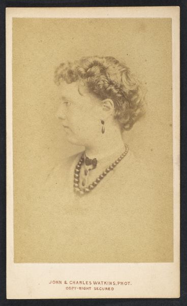 Editor: We are looking at an undated photograph entitled “[Adelaide Claxton]” from the 1860s by John and Charles Watkins. It’s a gelatin-silver print. I find the almost monochrome tonality gives the portrait a quiet, contemplative mood. What do you see when you look at this photograph? Curator: The interplay of light and shadow immediately captures my attention. Observe how the subtle gradations in tone delineate the subject's profile, emphasizing the line of the nose and the curve of the neck. The necklace with its prominent cross creates a strong visual anchor. Note its materiality. The textures captured reveal both the weight and smoothness of the beads and the fabric it hangs from. Does the shape of this piece strike you? Editor: Yes, the circular beads contrasting with the linear cross is interesting. It creates a visual push and pull, a sense of dynamic tension within a very still image. But what about the negative space surrounding the figure? It seems almost as important as the subject herself. Curator: Precisely. The generous amount of empty space directs our gaze towards the essential elements, framing them and allowing for a deeper engagement with the subject's features. The focus remains on the profile presented. The arrangement of dark and light across the face provides a sophisticated use of contrast to shape how we engage with the image, wouldn't you agree? Editor: I think so. Initially, I saw a simple portrait, but focusing on the composition, it’s clear there is a sophisticated arrangement of lines and shapes at work. Thank you for illuminating those for me! Curator: My pleasure. Close visual analysis often unveils a more profound understanding and greater appreciation for an image's complex construction.