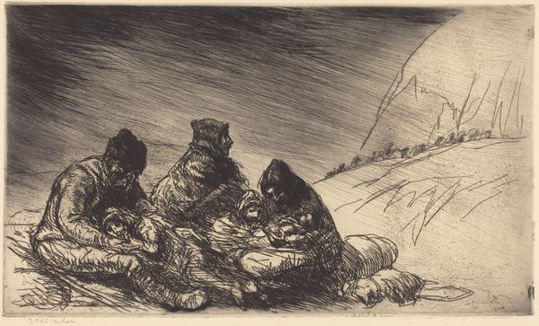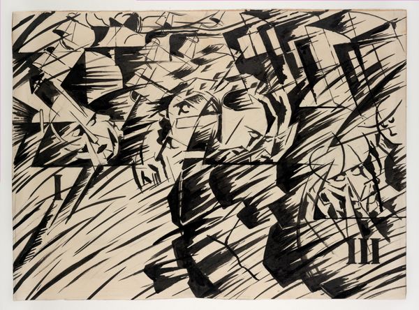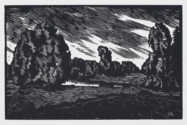Curator: Looking at this powerful woodcut from 1960 by Georgyi Yakutovytch, entitled "Arkan (Ukrainian dance)", one can’t help but notice its raw energy. Editor: Yes, that’s immediate. It feels almost violently dynamic. The high contrast and swirling lines contribute to a sense of controlled chaos. It gives you an exciting feeling. Curator: Precisely! Yakutovytch has expertly employed the woodcut medium here. See how he’s used the stark contrast of black and white to define forms and create a compelling visual rhythm? It echoes the movement he depicts. Editor: Absolutely. Consider the labor-intensive process behind this piece. The artist has to physically carve away at the wood, each mark a deliberate act. It speaks to the dedication and physical exertion involved in artistic creation, and that links to the theme of the dance itself, I'd argue. Curator: An astute point. Note, too, how Yakutovytch simplifies the figures and the landscape into these elemental forms. It leans toward abstraction while still conveying the essence of the Ukrainian dance, imbuing the folk tradition with new significance. The interplay of positive and negative space also pushes figuration to its limits. Editor: Right, it’s almost as if the dance's cultural weight and energy have been impressed upon the woodblock itself. This feels much more than illustration. One begins to understand Ukrainian art in its resistance and cultural identity under the Soviets. What seems to be an innocent folk dance isn't as apolitical as one might imagine, especially given that context and those sharp graphic forms. Curator: The bold strokes also capture a profound sense of momentum, conveying a story beyond the immediate subject matter. This visual metaphor adds layers to a narrative of resilience in an era dominated by other forces. Editor: Thinking about the way such graphic work spread widely via printing, consider also how that process democratizes art itself, and culture. This print is more than art on a gallery wall; it is evidence of labor and transmission of identity. It feels intensely communicative. Curator: I agree. It's a striking example of how formal innovation and traditional subject matter can come together. A narrative encapsulated through rhythm, contrast, and form. Editor: Ultimately, considering its cultural value, its visual construction and the printing method, it highlights a dynamic connection between material, culture, and form.