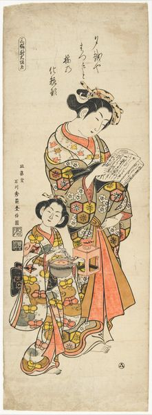 Here is a woodblock print by Okumura Toshinobu, made around the mid-18th century, depicting actors Ichimura Takenojō and Sanjō Kantarō. The print presents a visually intriguing scene, characterized by the use of flat planes of color and strong outlines. Consider the composition. It is divided into distinct areas: the figures themselves, the background wall, and the objects in the foreground. Toshinobu uses the lines and shapes to flatten the space, reducing depth and emphasizing the surface of the print. Notice the interplay of geometric and organic shapes. The actors’ robes are adorned with complex patterns of flowers, contrasted by the simple rectangles of the backdrop. This tension between flatness and representation plays with our perceptions of space and form. The semiotic system of signs and symbols, from the actor’s dress to the objects around them, are not just aesthetic choices. They communicate social and cultural meanings, reflecting the artistic and philosophical concerns of the time. This print embodies how visual elements function within a historical context, challenging us to consider the evolving nature of art and its interpretation.