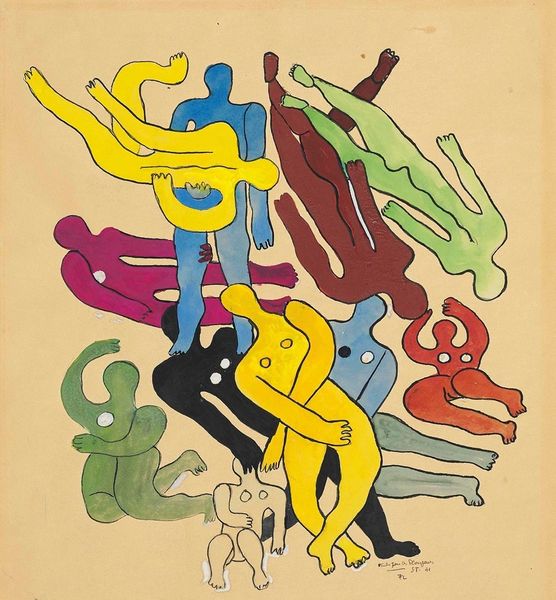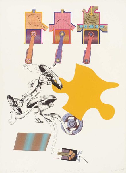 Curator: "5. Strong Motion" by Colin Lanceley... It feels like a playful dance, doesn't it? All these floating shapes and figures. Editor: The composition certainly commands attention. Notice how Lanceley disperses the imagery across the picture plane, creating a non-hierarchical field. Curator: And the textures! A photograph of a child, geometric blocks, and then these machine-like drawings... I wonder what "strong motion" meant to Lanceley? Maybe memories colliding? Editor: Semiotically, the collage technique disrupts any singular narrative. Each element functions as a signifier, prompting viewers to construct their own interpretations. Curator: It makes me think of those childhood games, where you build impossible contraptions from bits and bobs... Delightful! Editor: Indeed. A potent example of collage as both deconstruction and reimagining of form.