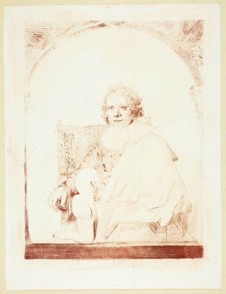 This print, Portrait of a Man in an Arm Chair, was made by Christian Josi sometime in the 18th or 19th century, using etching and possibly some hand-applied color. It's an interpretation of a drawing by one of the great masters, Rembrandt. But don’t think of this as merely a reproduction. Josi was working at a time when printmaking was less about accurately copying images, and more about creatively translating them. With its freely drawn lines and the soft texture created by the etching process, this print has an aesthetic all its own. The etching technique itself is also very important in understanding the social context of the artwork, allowing for the relatively quick and inexpensive reproduction of images. This made art more accessible to a wider audience, marking a shift in how art was consumed and valued. So, when we consider works like this, it reminds us that materials, making, and context all contribute to the artwork's meaning, challenging the rigid boundaries between different kinds of creative practices.