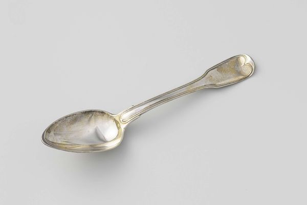 Curator: Here we have an object crafted around 1806 by silversmith Roelof Helweg. This is a silver spoon known as "Lepel met het helmteken Clifford" which, being at the Rijksmuseum, has clear connections to Dutch history. What are your initial impressions? Editor: Well, my first thought is just how intimately it connects us to the past. It's unassuming, really, yet this small object would have known touch, taste, and family stories—objects quietly hold a different sort of time. I see tradition, maybe wealth. There's an undeniable simplicity to its shape despite the craftsmanship. Curator: Indeed, its material reality speaks to an interesting historical phenomenon: Dutch Baroque silverwork, particularly functional items like this, were designed to broadcast wealth. Its mere presence on a table signals abundance. What interests me is how even such a mundane item incorporates heraldry – that ‘helmteken’ or crest would have signaled a very specific lineage. Editor: So this spoon isn’t just about eating; it's about saying something. Almost like early social media? Imagine the conversations it sparked; this spoon was, in a way, advertising the Clifford family! Now I can see the understated Baroque details – they didn’t scream "look at me!", but hinted at status, wealth, and history. I wonder what stories this particular spoon could tell about that family. Curator: Exactly. It's interesting to consider how the value of an object can shift so much over time. We look at it in a museum, focusing on its cultural, artistic, and historical significance, almost forgetting its initial domestic function. What meals did it serve, what hands held it? These silent witnesses truly saw the intimate aspects of people’s lives. Editor: Thinking about value—how the worth of heirlooms transform. From mere function, through social announcement, into the preciousness of cultural record! Something like a spoon ties material culture to identity so palpably. Makes me want to hold it, actually. What an experience to dine with a ghost from the past! Curator: Absolutely, the connection it creates to the past is visceral. We can analyze its baroque stylistic cues, its composition and material, and extract social data, but, fundamentally, this spoon prompts us to reflect on everyday lives that preceded us, linking us in both familiar and uncanny ways to earlier chapters of human experience. Editor: Looking at this silver spoon… it reflects that, doesn’t it? Thank you.