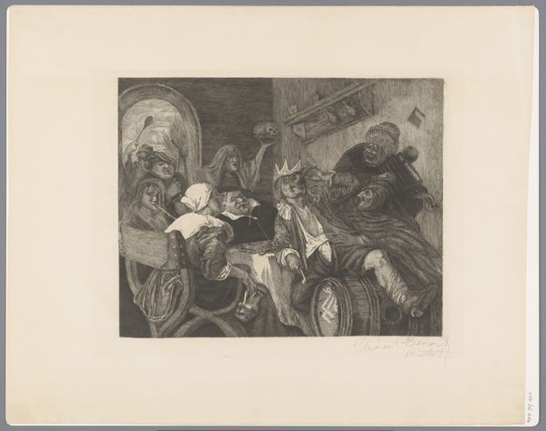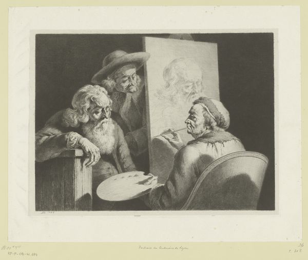 This print, "H. Sebastiaan martelaar" was made in the late 19th century by Louis Monziès using a technique called etching. Etching begins with a metal plate, typically copper or zinc. The artist coats the plate with a waxy, acid-resistant substance known as the 'ground'. Then, using a sharp needle, the artist scratches an image into the ground, revealing the metal underneath. The plate is then immersed in acid, which bites into the exposed lines, creating grooves. Ink is applied to the plate, filling these grooves, and the surface is wiped clean. Finally, the plate is pressed onto paper, transferring the image. The result is a print with fine, precise lines, lending itself well to detailed scenes and tonal gradations. Here, Monziès uses this technique to create a dramatic and emotionally charged scene, where the quality of the etched line adds to the somber mood. Etching democratized artmaking by allowing for multiple original prints to be created, instead of single originals. It's a process that bridges the gap between skilled craft and mass production, asking us to reconsider traditional hierarchies of art.