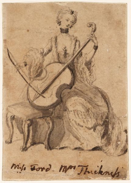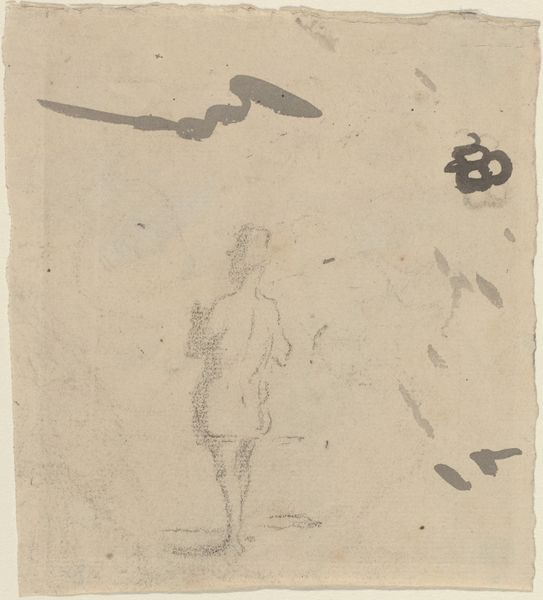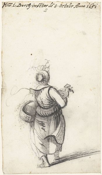 Editor: We're looking at "Vrouw met een stoof aan de arm, naar rechts," a watercolor and ink drawing by Harmen ter Borch from 1648. The piece has an off-the-cuff, immediate feel. What catches your eye about the composition of this work? Curator: The formal elements are compelling. Consider the economical use of line – how it defines the figure with minimal contour. Note, also, the intriguing ambiguity. The blue ink rendering presents a figure more suggested than explicitly depicted. Observe how the artist used line weight to differentiate textures and volume. Editor: Yes, I see that now! So, you're focusing on his choice of line and how he's rendering this woman. Is there a tension created by that economy of line against the potential detail? Curator: Precisely! It’s less about accurate representation and more about the interplay between line, form, and the tonality of the paper. The eye fills in the details. It prompts consideration: what purpose does it serve, and what new understanding may we infer from this choice of composition? Editor: That’s a helpful point. What I first read as simple is now actually…sophisticated. Curator: The beauty lies within these arrangements of forms and line. The intrinsic characteristics communicate directly, without narrative, which in this example serves as a means to allow the pure expressiveness of drawing to materialize. How does this influence your perspective on the work? Editor: It makes me consider artmaking as a decision-making process; and understanding those choices enhances my appreciation of a work. Curator: Indeed, recognizing this helps us connect with the artist's intention.