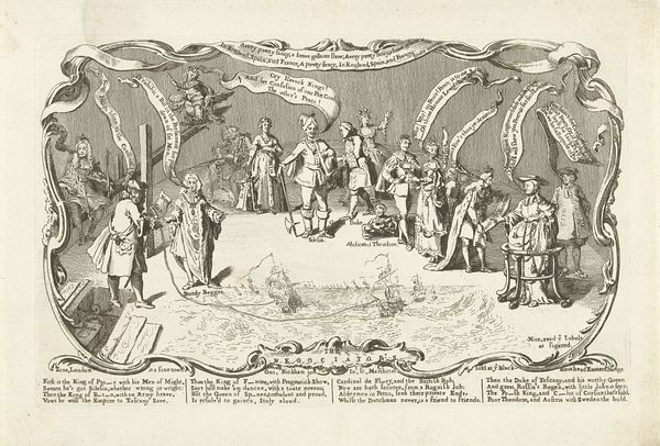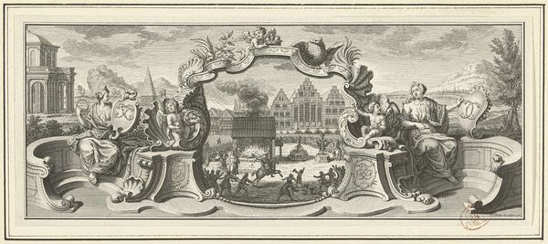 Curator: Here we have "Vignet met de kroning van Frans I Stefan tot keizer, 1745," an engraving dating from 1746, created by Jan Caspar Philips. Editor: It strikes me as a really interesting composition. There's this theatrical baroque frame encompassing a rather orderly scene. Almost as if reality is being filtered through a very specific lens of power. Curator: Precisely! The artist used this print, this image, to broadcast particular aspects of power in the Austro-Hungarian Empire. We're seeing the coronation ceremony of Francis I. How is it staged? Who has access? And what are the associated symbolic orders on display? Editor: The positioning is fascinating. We're kept at a distance from the main event. It's like being granted a privileged glimpse, yet also being held back. Is that distance intentional, do you think? Curator: I think so. By placing the viewer slightly outside the immediate sphere of power, the artist shapes our understanding of imperial authority. The allegorical figures on either side, framing the coronation, suggest particular ideals connected to Francis I's reign. The figures add layers of complex socio-political meaning. Who is given symbolic prominence, and who is not? The answers point us to hierarchies operating at the time. Editor: And that incredibly ornate frame—almost aggressive in its grandeur. It encloses the event but it also *announces* its importance to an audience beyond the coronation hall itself. This vignette becomes a tool of public relations as much as it is an historical record, right? Curator: Absolutely! This print becomes part of the spectacle of empire. By analyzing it, we unpack the power dynamics, scrutinize the players, and interrogate its claim to legitimate rule. Who benefits from this story of empire, and who might be obscured or even harmed by it? That, I think, is where real understanding lies. Editor: So, in viewing an image like this, what starts as a picture of historical fact then turns into this investigation of representation itself. It makes me wonder, which stories of our time are going to stand the test of time and who is going to be charged to investigate them critically? Curator: An astute observation that reveals the true richness held by an artwork.