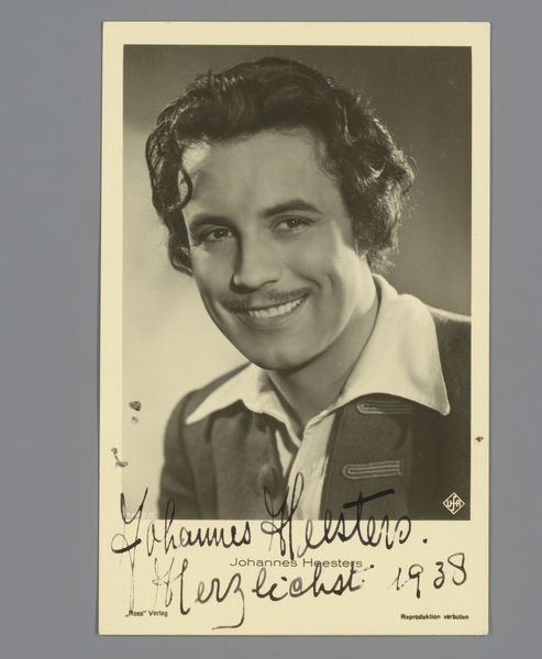 Curator: Let's turn our attention to this striking gelatin-silver print, simply titled "Portret van de acteur Cary Grant", placing its creation somewhere between 1930 and 1940. The iconic actor's image has an air of cool sophistication. Editor: It does! The tones, that gray scale, make the materiality of the print so very clear; you can almost feel the smoothness of the glossy paper. His gaze seems carefully crafted. Curator: Absolutely. Knowing Grant's careful control over his public persona, and the studios’ involvement in crafting stardom, that perceived authenticity becomes suspect. His effortless charisma was itself manufactured. Editor: Manufactured charisma – interesting framing. It highlights the industry behind this kind of portraiture, where even a "candid" shot is mediated. The gelatine silver print itself, with its specific chemical composition and labor, plays into this. It is not just his face on display, it is also this material and labor. Curator: Precisely. It speaks volumes about the burgeoning star system and the rise of celebrity culture during the early to mid-20th century. Photography allowed for the mass dissemination of images, reinforcing the public's adoration and expectations. Editor: It’s fascinating how such a seemingly straightforward portrait actually becomes a point of reflection about labor. Think of all the takes of photography required just to find the right frame! Curator: That's the core of his enduring appeal. It’s tied to a very specific moment of social and artistic change; that this piece, by preserving an image, has opened for discussion today is, perhaps, its most powerful element. Editor: Indeed, what is presented as effortlessly accessible contains hidden processes worth discussing. And the way light and material come together here creates a real impression of accessibility.