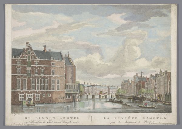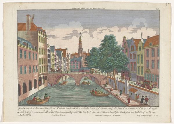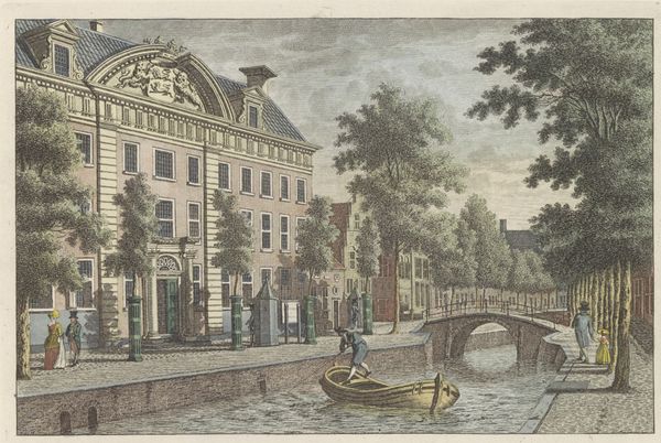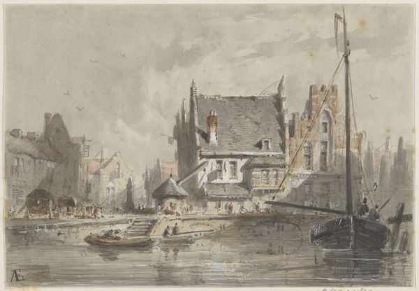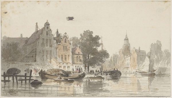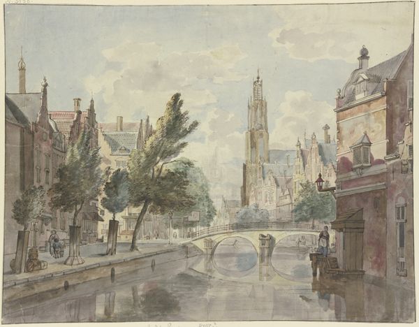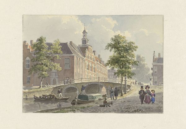 Curator: This is a watercolor drawing by Jan Hendrik Verheijen, titled "Gracht in een stad met een torentje bij een stenen brug"—Canal in a city with a small tower near a stone bridge. Its creation is dated sometime between 1788 and 1846. Editor: It feels… placid. The cool, muted colors evoke a sense of quiet industriousness. Even the tower, usually a symbol of power, seems softened by the light and gentle application of paint. Curator: Precisely! Verheijen’s piece embodies a Romantic fascination with the Dutch Golden Age, not just stylistically, but also in its portrayal of civic life. There’s an inherent idealized perspective at play. Editor: I notice the prominent tower features heavily in the composition. Does that architectural choice mean something beyond just its structure? Its design and placement, especially with the waterway, feels very deliberate. Curator: It is! Waterways in Dutch art, especially during this period, often represent trade, prosperity, and connectivity. Towers like this sometimes functioned as weigh houses. Their presence in art elevated the importance of local civic functions. Editor: Ah, like an early form of branding! The symbols work together to convey a specific message about this city's identity, wealth, and perhaps a sense of order. Curator: Absolutely, while the overall painting is not propagandistic in nature, it still manages to imbue a sense of patriotic pride. Editor: The tiny figures add such a human touch to the grand scheme. Each seems to have a role in this thriving community, quietly but vitally contributing. You can even see men fishing from their small boats. Curator: Yes, Verheijen successfully merges topographical precision with a lively genre scene. The seemingly mundane is, in fact, filled with symbolism. It acts almost like a time capsule, conveying visual language that was readily readable for audiences of its era. Editor: Looking closely, one can really appreciate the skill involved in creating such a detailed image using watercolors. There are nuances within a pale pallete that elevate what at first glance might seem simplistic. Curator: Indeed, it is the subtleties, those details, which make it such an intriguing piece of art history. Verheijen, consciously or unconsciously, gives the ordinary iconic status. Editor: Well, that was unexpectedly enriching. I think I’ll seek out more of Verheijen's work—I am fascinated to know more about these visual messages from history.