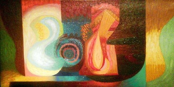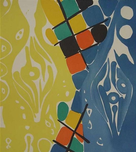 Editor: This is Jagdish Swaminathan's "Red and Yellow with Bird," painted in 1972 using acrylic on canvas. The geometric composition and vibrant colors give it a rather playful, yet unsettling quality. How would you interpret this work based on its formal qualities? Curator: The interplay of forms commands our attention, wouldn’t you agree? Note how the artist employs distinct planes of color, fracturing the picture plane. These seemingly disparate geometric forms are bound through the unifying yellow background and the bird motif that anchors the top edge. The texture created by the brushstrokes also serves to emphasize the materiality of the paint itself. Do you find a spatial depth created in the composition? Editor: I see what you mean about the fragmented planes. I hadn't considered how the textures contribute to that sense of surface. The colors certainly pop, especially with that bright red. Does the "bird" impact your interpretation, or is it purely another formal element? Curator: The bird provides a focal point and, perhaps, a sense of scale, without diminishing the abstraction. Observe how it interacts with the flat blocks of color. Swaminathan challenges traditional perspective, favoring a dynamic arrangement where color and form dictate space. Editor: It's interesting how he uses a representational element within such an abstract design, rather than making this exclusively geometric or purely non-objective. Curator: Precisely. This tension creates dynamism. What appeared chaotic becomes meticulously calibrated when assessing colour distribution. How does this enhance or detract from your own interpretation? Editor: Initially I saw disjointed shapes, now I perceive a careful balance and control, linking realism and geometric shapes on a surface. Thanks for helping to clarify the components of this art. Curator: It’s the beauty of formalism isn’t it: structure emerges from scrutiny.