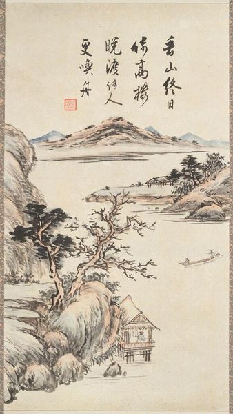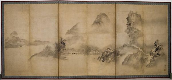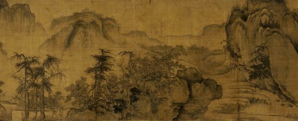 Editor: This ink and watercolor painting, “Old Trees, Level Distance,” was created around 1080 by Guo Xi. The subtle washes give it a hazy, almost dreamlike quality. What’s most interesting to you about the materiality of this piece? Curator: I am fascinated by the societal forces embedded within it. Consider the labor: from the cultivation of the mulberry to produce the paper, to the grinding of inkstones. It represents a whole network of producers supporting the elite’s artistic endeavors. Editor: So, you're focusing less on Guo Xi's individual expression and more on the means by which this art object came into being? Curator: Precisely. The “dreamlike quality” you perceive is directly related to the refined materials and processes available only to a specific class. Ink wash painting like this also represents a standardization of technique, a certain commodification of landscape itself, intended for consumption and display. Notice also how the seals on the art affect the materiality of it as an art object. Editor: That's a fascinating point about the seals. It shows it changed ownership, maybe influencing value and how it was treated. Were such paintings expensive to make back then? Curator: Highly. The pigments, especially those vibrant colours, would have been derived from rare minerals or plants, often imported over vast distances. Think about the cost of transport, the specialised knowledge required for their preparation... It elevates the landscape to the realm of a luxury commodity, to a social symbol. Editor: So, viewing it as more than just a pretty picture and analyzing all the aspects that created it can tell us a lot more. I see your point. Curator: Exactly. By deconstructing the process of its creation, we begin to understand the socio-economic dynamics that shaped even what we perceive as individual artistry. Editor: It adds a completely new depth to what I thought was just a serene landscape. I will always wonder who grew the trees, the mulberry, or mixed the inks. Thanks!