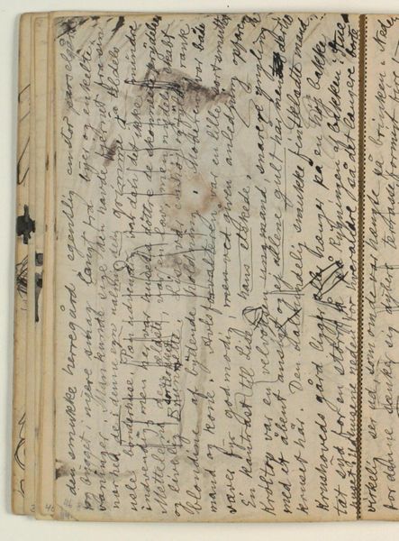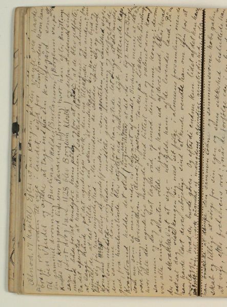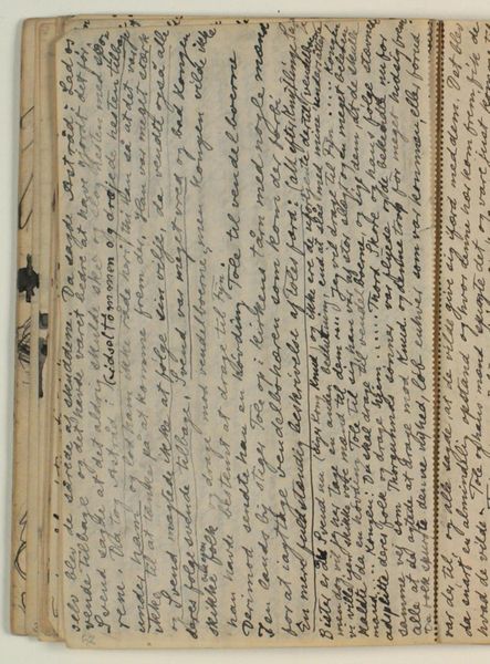 This is a page from a notebook, a written note by Niels Larsen Stevns, made sometime in the late 19th or early 20th century. The artist's hand dances across the page, a flurry of marks in black ink, full of both urgency and precision. The texture of the paper seems almost palpable, as if I could run my fingers over its surface and feel the slight give of the page. The ink is dense and opaque, leaving no room for light to penetrate. Each stroke is a testament to the artist's physical engagement with the medium, a record of movement and intention. Look at the way the words and lines pile up, creating a sense of depth and complexity. It's like a city viewed from above, a tangle of streets and buildings that somehow resolves into a coherent whole. The overall effect is one of organized chaos. It puts me in mind of Cy Twombly, another artist who found beauty in the scribbled line, and reminds us that art is always a conversation, a back-and-forth between different voices across time. In the end, it’s about embracing the mess and finding meaning within it.