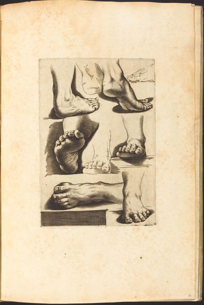 Editor: Here we have Luca Ciamberlano’s “Print from Drawing Book,” an engraving from around 1610 to 1620. It’s a surprisingly intimate study of…feet! The textures and shading feel very deliberate, almost reverential. What's your take on this unexpected subject matter? Curator: Ah, feet! Aren’t they wonderfully expressive? Luca’s got me thinking, you know? Why feet? Is it merely anatomical study? Or perhaps a secret language? What tales do these tired travelers whisper? This piece echoes the Renaissance fascination with classical form, rendered here in the vulnerable reality of…pedal extremities! Each line, each shadow, celebrates the weight, the journey imprinted upon them. Almost like a roadmap of a life lived, don't you think? What stands out most to you? Editor: I hadn’t considered them as telling a story! I was so focused on the almost clinical detail. Now, seeing them as roadmaps...wow! So, practice makes perfect for the artist too, huh? Curator: Absolutely! They are like characters, caught mid-dance or a ponderous march across the Earth! These feet are not pristine ideals, darling, but lived-in, worked-upon, slightly wonky beings. And within this “wonkiness,” wouldn’t you say Luca reveals humanity at its most genuine and touchingly imperfect? Editor: Definitely! I'll never look at feet the same way again. Curator: Exactly! A mundane becomes magical with the touch of curiosity and open eyes. Now, doesn't that make us want to kick off our shoes and leave our own prints on the world? Editor: It certainly does. Thanks for untangling this piece with me!