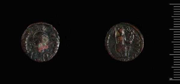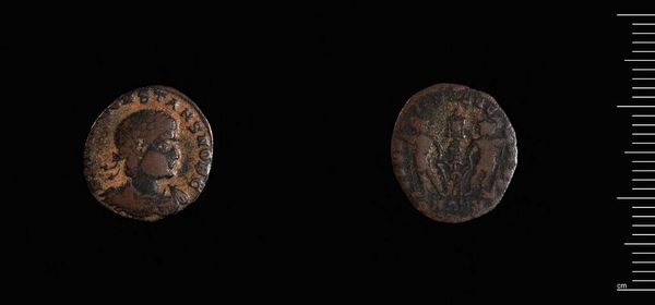 Editor: So, this is a bronze coin, identified as an AE4 of Constantius II. Given its age and purpose, it’s interesting how much the imagery feels like propaganda. What strikes you most about it? Curator: Absolutely. Coins were powerful tools. Consider how Constantius II, inheriting a fractured empire, used images to project strength and legitimacy. How does this coin participate in creating a visual narrative of imperial power? Editor: I see the profile of the emperor, very rigid and formal. On the reverse, it seems to be some kind of victory scene? Curator: Exactly. Victory, often personified as a goddess, becomes entangled with imperial authority. Reflect on how such depictions reinforce a specific, and often exclusionary, power structure. What message is being sent, and who is it intended for? Editor: It makes you think about how even small, everyday objects can be loaded with political meaning. Curator: Precisely. This coin isn't just currency; it's a carefully crafted message about power, control, and the emperor's place in the world.