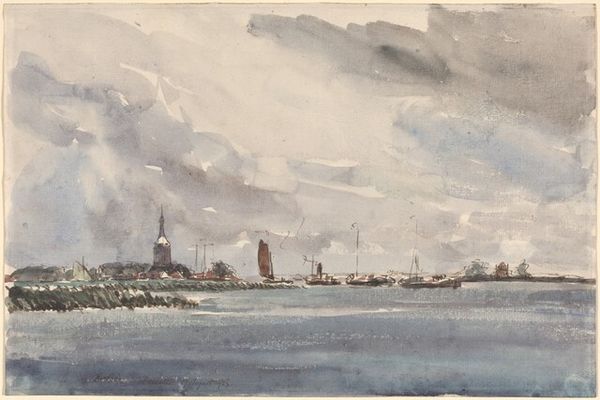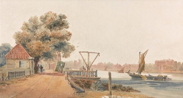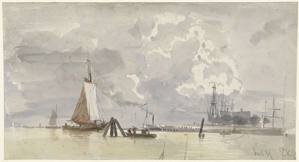 Curator: Robert Charles Dudley created this evocative watercolor and graphite drawing, entitled "The Cable Passed From the Works into the Hulk (the Old Frigate Iris) Lying in the Thames at Greenwich" between 1865 and 1866. It's currently held at the Metropolitan Museum of Art. Editor: My first impression is melancholic. There’s a sense of industrial decline looming, captured in this almost ghostly rendering of a ship and dock. Curator: Indeed. The hulk of the Iris, a former warship now reduced to serving as a cable-laying vessel, is rich in symbolic significance. Consider how ships historically represent journeys and power. This ship, in its decline, signifies the shifting tides of empire, the transition from sail to steam, and perhaps even broader societal anxieties regarding industrialization and obsolescence. Editor: Right, this isn't just about technological advancement. It speaks volumes about Britain’s naval prowess beginning to diminish at the time. You've got the physical decay of the ship mirroring anxieties of losing global dominance. Curator: Absolutely. Dudley seems fascinated by the way objects carry cultural memory, you see it even in the placement of the cable, suggesting a connection to a larger, unseen world beyond the frame. The cable is the literal connecting factor. The ship as a symbol transforms when attached to a cable-- it is connected to the social reality. Editor: That’s an interesting observation about the cable. It is the link to further extraction and perhaps the beginning of international telecommunication. Looking at this composition through a postcolonial lens, the industrial advancements become complicated, because what does this technological shift mean to exploited populations? Curator: That reading makes visible the way seemingly innocuous scenes are imbued with a legacy of control and resource exploitation. The seemingly muted palette serves only to reinforce those underlying emotional themes, adding to the aura of decay you picked up on at first. It prompts a reflection on the costs, both tangible and intangible, associated with "progress". Editor: Looking again, the water itself isn’t serene but almost disturbed. And the lack of vibrant color—almost monochrome —emphasizes the solemnity of the moment. It makes you consider those working in the shadow of progress and who have likely been written out of official historical accounts. Curator: And as an artwork, it’s a potent reminder that even images of industrial progress can carry narratives of loss, transition, and ultimately, cultural transformation. Editor: This makes me think a lot about how artists can invite conversations around social responsibility. What begins as an unassuming sketch ultimately leads to much needed discourse.