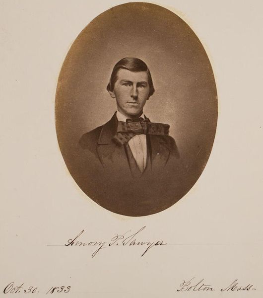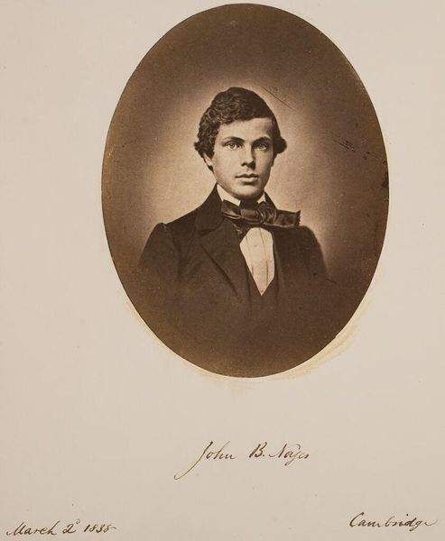 Curator: This is a portrait of James Clarke Davis, taken in Greenfield, Massachusetts, by John Adams Whipple, around 1838. The daguerreotype process renders a soft, almost ethereal image. Editor: The subdued tones and oval vignette give it a really intimate feel, almost as if we are looking into a locket. I wonder about the labor involved in producing this, from mining the silver to polishing the plate. Curator: The formal attire, the carefully arranged hair—it speaks to the sitter's status and the aspirations of the time. It echoes classical portraiture but through a modern lens, a new technology capturing a moment. Editor: It's interesting how photography democratized portraiture. Suddenly, access wasn't just for the wealthy; it expanded the field, while still needing to be processed by craftspeople. Curator: Indeed, it's a potent symbol of a changing era, preserving individual identity, and speaking to the hope inherent in progress. Editor: A lasting material record, both fragile and enduring. It makes you consider the layers of history embedded in this one image.