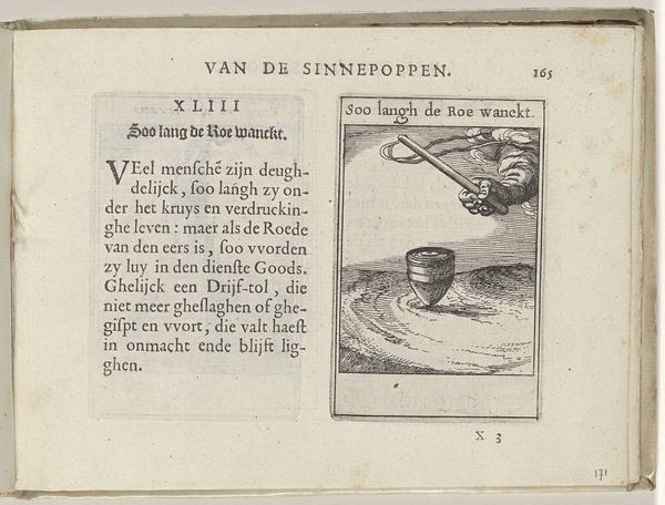 This engraving, "XXXI Op dat het recht gae," was created by Roemer Visscher, sometime before his death in 1620. It is an etching printed on paper. The image is a visual pun of sorts, literally portraying the act of making right. It depicts a hand carefully gluing feathers to an arrow. The artist has used precise lines to give texture to the hand, the arrow and the cloud, and the image is accompanied by a block of letterpress text that elaborates on the theme. Prints like this one were made with relative ease, allowing for mass production and wide distribution. It's a far cry from the labor-intensive craft traditions, and more aligned with early forms of industrial production. The very nature of printmaking allows for dissemination of ideas and imagery, reflecting the burgeoning print culture of the time. Considering the materials, processes, and social context, we can appreciate the ingenuity and artistry involved in creating such a work, and how it blurred the boundaries between art, craft, and commerce.