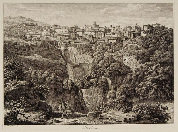 Editor: This is Albert Christoph Dies' "Tivoli", rendered in what looks like an etching. The scene feels almost theatrical, with the town perched precariously above the falls. What cultural weight does the image of Tivoli carry for you? Curator: The image of Tivoli, particularly its waterfalls and ancient ruins, became a potent symbol during the Grand Tour era. Dies captures more than a landscape; he evokes a dialogue between the classical past and the present. The falls themselves can symbolize the sublime power of nature, contrasting with the ordered architecture. What feelings does that tension evoke in you? Editor: A sense of romantic awe, definitely. The lone figure emphasizes human insignificance against the vastness and history of the scene. Curator: Precisely. The lone figure, a recurring motif in Romantic art, invites viewers to contemplate their place within the grand narrative of history and nature. This image then preserves not just a place, but a feeling. Editor: I see it now, it's like a visual memory, preserved and shared. Thank you for pointing that out!