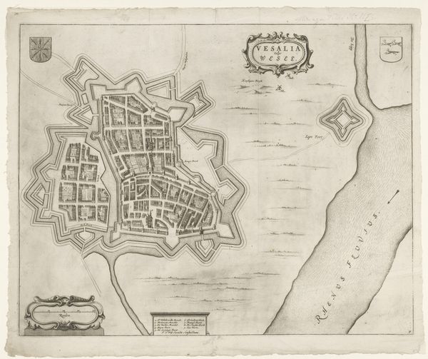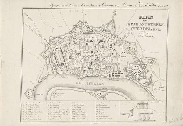 Curator: Here we have an intriguing cartographic drawing, “Kaart van Antwerpen met de stelling der Vijandelijke Armee, van den 12 December 1832,” or “Map of Antwerp with the Position of the Enemy Army, from December 12, 1832." Created circa 1832-1833, its author is anonymous. It combines pen, ink, and print on paper, currently residing at the Rijksmuseum. What strikes you about it? Editor: The intricacy is captivating! It feels very formal, even sterile, until you consider the subject matter: a city under siege. I immediately see a network, carefully planned, and subtly menacing in its detail. Curator: Maps have always held power as symbolic representations of territory and control. Here, Antwerp is not merely depicted; it’s presented as a contested space. What can the imagery of fortification, the "stelling" or position of enemy armies, tell us about collective anxiety during that era? Editor: It’s fascinating how geometric precision overlays a narrative of conflict. Those lines and angles weren't just about geography; they represented political boundaries, social divisions, and military strategies. Notice how the key identifies strategic points—moats, redoubts—almost as if deciphering a code. Curator: Exactly! The symbols, beyond their practical purpose, tap into deeper cultural understanding of defense, power, and threat. Consider the repeated shapes—the fortresses resemble eyes watching, reminding us of a constant state of vigilance. It’s a visual language understood even by those who couldn’t read the labels. How do you read that river splitting through the composition? Editor: The river Schelde bisects the city but it is also part of its defense. Antwerp's fate is linked to that waterway—a source of commerce, but also vulnerability. We see little boats near the riverbanks and, it appears like the drawing intends to give the viewer some insight into its complex and tumultuous history. Curator: The inclusion of those small ships subtly directs the viewer towards a broader perspective. They signify potential routes of attack, but also continued commerce and connection even amid conflict. It creates an emotional undercurrent of resilience, even survival, persisting beneath the documented aggression. Editor: So, beyond its function as a historical document, the piece evokes these ideas of power, conflict, and resilience that have resonance even today. It also sparks my curiosity, making me think about what symbols of our own cities today may hold and represent in the future. Curator: Precisely. Through understanding this anonymous cartographer’s choice of line, symbol, and layout, we unearth how a simple map can speak volumes about the cultural and emotional landscape of its time.