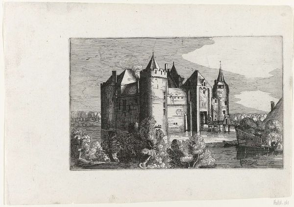 Curator: Today, we're observing an engraving created between 1750 and 1783 by Simon Fokke, entitled “Beleg van slot Hagestein door graaf Willem VI, 1405” which translates to “The Siege of Hagestein Castle by Count William VI, 1405.” Editor: My initial impression is of dramatic action, albeit in miniature. The tight hatching and line work gives a certain delicacy to a violent scene. It also creates a somewhat bleak atmosphere—fitting for a depiction of war. Curator: Absolutely, the dense composition channels Baroque aesthetics in its employment of dynamic symmetry and compressed depth. Fokke organizes space through stark tonal contrast; the light falling selectively to emphasize the siege unfolding at the castle walls. Editor: Focusing on the iconography, notice how the castle is not merely a building, but a potent symbol of authority and resistance. Castles have a history of representing the establishment and nobility; so here, in flames, it conveys upheaval and changing power dynamics. Curator: Quite right, the formal qualities and imagery align to create narrative tension, even without full chromatic range. Fokke masterfully uses texture achieved through the engraving process itself, mimicking the chaos of battle and solidifying the thematic relevance of the piece. The way he rendered smoke suggests movement that adds layers of depth. Editor: Consider the deeper cultural implications. The work's historical subject ties it to enduring narratives of power and territorial disputes, but what really captures the viewer's attention is the psychological component inherent in conflict: aggression, vulnerability, dominance, and survival are visually embedded in the graphic language of the battle scene. Curator: Reflecting on the interplay of form and subject matter here in Simon Fokke’s work, one comes away with a sense of calculated artistry designed to deliver a vivid history lesson. Editor: And when you look deeper, past the literal, to the images' psychological undertones, Fokke has also composed a resonant reminder of our timeless human dramas.