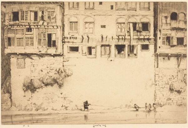 Joseph Pennell made this etching of the Mercato Vecchio using a metal plate, likely copper or zinc. The image was created by incising lines into the plate, inking it, and then pressing it onto paper, a process that allows for multiple impressions. The character of the etched line is crucial here. Notice how it varies in weight and density, giving a sense of depth and atmosphere. Pennell was a master of this medium, exploiting its potential to capture the energy of the modern city. The rapid, almost scribbled lines convey a sense of immediacy, as if the scene were captured in a fleeting moment. Think of the labor involved: the careful preparation of the plate, the precise etching, the inking and printing. This isn’t just a picture of a marketplace; it’s a record of a skilled artisan engaging with the urban landscape, transforming it through a complex, time-honored process. It’s a powerful reminder that even in an age of mass production, the hand of the maker still holds sway.