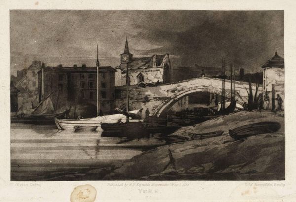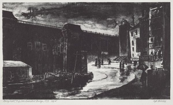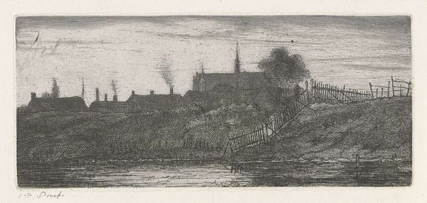 Curator: This etching, "The Old Jail," was completed by Muirhead Bone in 1899. What strikes you first about this print? Editor: The overwhelming sense of decay and confinement. The structure seems almost to loom over us, obscuring any sense of escape or hope. The tonal gradations create a really somber mood. Curator: I find the architecture particularly interesting. Note how Bone utilizes line and shadow to construct the building. Observe how his technique draws attention to the geometrical forms of the prison and contrasts them with the organic textures of the foreground. Editor: Absolutely, but it's impossible to ignore the history embedded within those walls. Prisons are never neutral spaces. They reflect societal power structures, prejudices, and failed attempts at rehabilitation. Bone completed this piece during the height of the British Empire, an era of immense social upheaval in the UK. I wonder what political commentary he hoped to create with this work. Curator: Such contexts might provide ways of enriching our viewing of Bone’s picture. But the composition itself is carefully organized to draw your eye toward the main gate and along the lengthy building, using sophisticated arrangements to convey architectural forms. This visual organization encourages further investigation and understanding. Editor: Of course. Still, considering this was made in 1899, it’s easy to imagine the very real human stories behind that "realist" portrayal. "The Old Jail" is more than just lines and shades; it is an encapsulation of human struggle. How do such stark buildings become symbols of oppression for those excluded or contained? Curator: An excellent question, though difficult to represent without losing focus on the more significant compositional components. These features define what and how the space is delivered through his delicate touches, a crucial aspect of art creation. Editor: Thank you. Hopefully, future visitors can delve deeply into all of this. Curator: Indeed. It seems clear Bone created a lasting reflection with profound complexity, inviting all viewers to contemplate its essence.