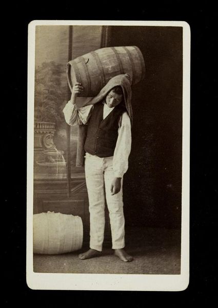 Curator: This mounted albumen print, titled "Costumes of Michaelenses, Azores, Portugal", captures a barefoot man with a basket of fruit, by A.J. Rapozo. Editor: The sepia tones evoke a bygone era. The composition, with the subject centrally framed, offers a stark sense of his labor. Curator: Indeed. Consider the subject's attire, which signifies regional identity and perhaps even a socio-economic class. The sack, the basket overflowing with fruit - symbols of sustenance. Editor: The texture of the woven hat against the roughspun fabric of his sacks provides a compelling visual contrast. Curator: It also calls to mind questions of representation and the photographer’s role in shaping perceptions of culture. Editor: An image frozen in time, imbued with the texture of daily life. Curator: A study in light and shadow, revealing so much. Editor: A poignant glimpse into another world.