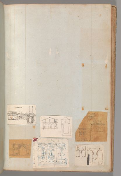 Curator: This is a page from a scrapbook by Charles Percier, created sometime between 1795 and 1805. The scrapbook page features both drawings and prints of architecture, interiors, furniture, and other objects, and resides here at the Metropolitan Museum of Art. Editor: It's curious how flat and linear the architecture looks. I am immediately drawn to the monochromatic palette—a sepia-toned piece that’s aged, imparting a sense of faded grandeur and precise geometric forms against the stark emptiness of the scrapbook page, it almost appears collage-like. Curator: Percier was a leading figure in the Neoclassical movement. This aesthetic shift represented a longing for the perceived order and harmony of the ancient world during a period of considerable social and political change in France, not long after the Revolution. Notice the meticulous detail of architectural plans, pointing to Percier’s involvement in reshaping French design. Editor: The intricate rendering reveals a fascination with symmetry and proportion. This order reflects an intellectual rigor. We are compelled to analyze the relationships between different segments of space and structure. Each line seems deliberate. What is most appealing is that the composition is a series of separate works in different sizes and visual weights carefully pasted down. Curator: These images document, and to some extent, disseminate particular aesthetics of power and taste. Scrapbooks were an essential means of circulating visual ideas. Percier shaped not only grand monuments, but, importantly, public opinion around architecture. Editor: Consider, too, how this organization mimics a collage. Each image block contains within itself smaller arrangements of objects or spaces. Curator: So, by assembling different examples together, the page performs the active dialogue that characterized interior and exterior design at the turn of the 19th Century. It's no coincidence these interiors were popular as Napoleon attempted to legitimate his new empire through a highly curated, visually striking aesthetic program. Editor: Thank you. It is fascinating to examine design beyond mere construction or practicality, instead through the lens of formal balance, and, equally, socio-political forces that helped shaped a specific historical epoch.