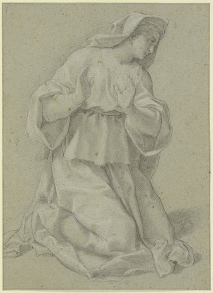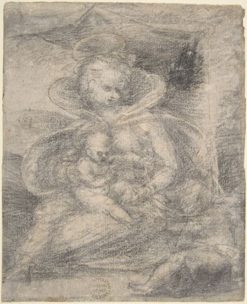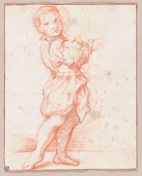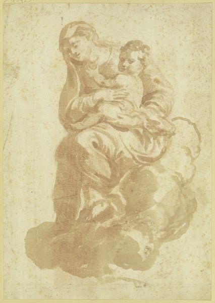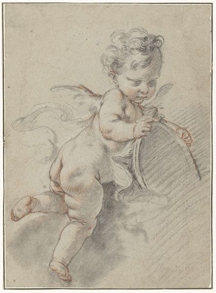 Giovanni Battista Tiepolo created this drawing, "Three Cherubs and a Beribboned Staff," using red chalk on blue paper. The choice of materials is significant; red chalk allowed Tiepolo to achieve a range of tones and textures, essential for capturing the soft, cherubic faces. The blue paper serves as a mid-tone, enhancing the luminosity of the red chalk highlights and deepening the shadows. Tiepolo's technique involved layering chalk strokes to build form and volume, demonstrating a mastery of draftsmanship. The medium of drawing allowed for a directness and immediacy, revealing the artist's hand in the swift, confident lines. In his time, the drawings would have been considered less important than paintings, being seen as preparatory. But today, we recognize the skill involved in drawing, and its capacity to explore social narratives. It is tempting to speculate on the labour and devotion involved in creating red chalks, or the manufacture of blue paper. Paying attention to materials and processes helps us understand the artist's skill, and the value we give to artworks of this kind.