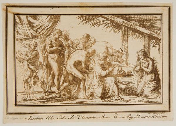 Curator: Bernard Picart’s etching, "Tobie's Wedding," presents a scene of domesticity, rendered in delicate lines. The sepia tones give it a timeless quality. Editor: There’s a clear hierarchy displayed. The men sit at the table, the women serve, and the angel…guards? It’s a fascinating look at societal roles. Curator: The labor involved in creating this intaglio print is also of interest. Each line painstakingly etched, reflecting the labor inherent in traditional marriage itself. Editor: Right, and seeing this image now, we have to acknowledge that marriage, historically, was as much about property and lineage as it was about love. The angel's presence only amplifies that. Curator: Ultimately, Picart’s print offers a glimpse into the material culture of the 18th century, providing insight into the means of production and also into the social contracts of its time. Editor: Precisely. By examining this image, we are also interrogating the power dynamics that underpinned the creation and consumption of such images in their historical moment, and perhaps even today.