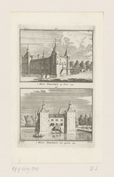 Editor: This print, "Twee gezichten op Kasteel Doorwerth, van voor en van achter gezien," made between 1745 and 1792 by Hendrik Spilman, shows two views of Doorwerth Castle rendered in etching and engraving. I'm struck by how it showcases the castle's dual nature - its imposing fortress-like presence and its position within the landscape. What stands out to you? Curator: It's fascinating to consider these prints in relation to the evolving role of castles within 18th-century society. We're seeing a shift away from castles as purely military structures. This is towards seeing them more as symbols of heritage and national identity. Think about it – why create multiple views? Who was the intended audience? Editor: Maybe to show off different architectural elements? Or cater to a growing public interested in their national monuments and landscapes? Curator: Precisely! The rise of tourism and increased interest in the past fuelled a demand for these kinds of images. Prints like these democratized access to important landmarks. Spilman’s work not only depicts the castle, but it also subtly participates in shaping public perception. We see Doorwerth framed almost like a stage set for the narratives of Dutch history. Editor: So the artwork isn’t just about depicting a castle; it’s about constructing a narrative around it and its place in society. Is that right? Curator: Exactly! The print participates in broader conversations about national pride, landscape, and the cultural significance of historical buildings. It encouraged a sense of shared identity and connection to the past amongst its viewers. Editor: I hadn't thought about the socio-political forces shaping how we even *see* something like a castle! Curator: These kinds of visual representations really mediated the public understanding and appreciation of cultural heritage, don't you agree? It goes beyond just the image, doesn't it?