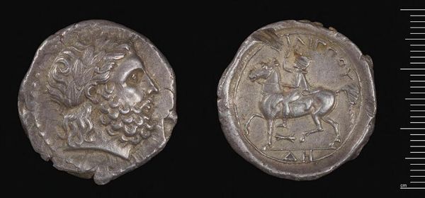 Editor: This is a Tetradrachm of Katane, a coin signed by Herakleidas. It’s part of the Harvard Art Museums collection. The coin is pretty worn, but you can still make out a chariot and a head in profile. What can you tell me about the imagery on a coin like this? Curator: Coins like this one reveal much about a society’s values. This coin served not just as currency, but also as propaganda. The imagery - the chariot race, the god or hero's head - spoke to Katane's wealth, military strength, and cultural identity. How do you think these images would have been received by the public? Editor: I guess they would have felt proud of their city. It’s like a little billboard. Curator: Precisely! It highlights the intersection of art, commerce, and civic pride in the ancient world. Now, what does learning about coins tell us about society? Editor: I see. It's a small object carrying a lot of weight, symbolically and historically.