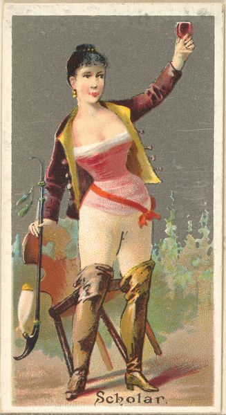 Editor: Here we have “Policeman, from the Occupations for Women series” by Goodwin & Company, created in 1887. It’s a color drawing, almost cartoonish, made for Old Judge and Dogs Head Cigarettes. The figure, a woman in a quirky police uniform, gives it an almost satirical mood, yet I’m curious what’s behind such a bizarre image. What do you make of this work? Curator: It’s fascinating how seemingly simple objects like trade cards can reveal a lot about the socio-political climate of a period. Think about what was happening in 1887. The late 19th century saw burgeoning debates around women’s roles, and advertising became a key battleground. This isn't just a random image; it reflects both anxieties and nascent aspirations related to gender roles. Editor: So, the "Occupation for Women series" was perhaps commenting on these changing roles, even if ironically? Curator: Precisely. Note the figure’s stylized, almost theatrical presentation. It presents a romanticized notion that feels at once both empowering and somewhat mocking, highlighting the spectacle and perceived absurdity of a woman in such a profession during this time. This commercial artwork subtly reinforces or questions prevailing gender norms. Where would this piece be exhibited? Editor: You are right, originally as promotional material distributed with cigarettes, now in the Met… it's travelled through time. Thinking of this drawing and it's placement in different settings helps to uncover the political messages throughout the decades. Curator: Exactly! Placing it in the MET reshapes its purpose again by granting historical context. We are interpreting it now. Editor: This card suddenly seems more meaningful and I can see so much history beneath it's colours and playful character! Curator: Indeed, it illustrates the crucial relationship between artistic production and its sociocultural and institutional context, doesn't it?