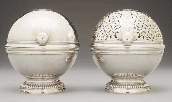Editor: Okay, next up we have what's called "Pair of sponge boxes," dating back to 1775, crafted by Claude-Pierre Deville. They're silver, so small but quite weighty, and the intricate floral design gives them this fancy, delicate feel. Honestly, they remind me of little bejeweled eggs. What stands out to you when you look at them? Curator: Bejeweled eggs – I adore that! For me, it's about thinking beyond their practical function. They were beautiful objects that were there as little gestures that signified an aesthetic life. Do you get that, beyond the sponge part of it? I mean, who wants a gorgeous sponge box now? Unless, perhaps... for art sponges! Editor: So, it's almost about the *idea* of luxury, of even mundane items having artistic value? Curator: Precisely. And the Rococo style! Think powdered wigs, extravagant balls... a world obsessed with ornament. It's a counterpoint to our world, which has different rules. If one did this kind of adornment today one would have to ask what you're doing, why, what does it mean…it is more reflective… more… loaded. Whereas back then, it simply meant *this is it*. Editor: I guess context really changes everything. Today this level of ornamentation would probably be a political statement. It’s interesting to imagine the boxes embodying such different meanings through time. Curator: Indeed. They ask more of *us* than the folks at the time I imagine. These ornate silver balls once quietly served a purpose, they're now prompting an inner dialogue, like secret portals to another dimension!