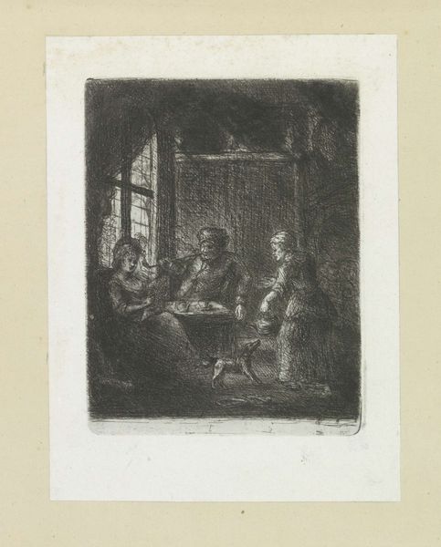 Daniel Nikolaus Chodowiecki made this etching, 'Harlequin with folded arms next to his wife', in the late 18th century. Here, Chodowiecki offers us a glimpse into the private lives of actors, specifically a male performer in the commedia dell'arte tradition. Commedia dell'arte emerged in 16th-century Italy and quickly spread throughout Europe. These travelling troupes relied on improvisation and stock characters, such as Harlequin, to entertain audiences with satire and wit. By the 1700s, going to the theatre became an increasingly public and institutionalised form of social activity, governed by social hierarchies. This etching not only acknowledges the significance of theatre but also subtly comments on the social structures of its time. The contrast between the public and private lives of performers and between the freedom of the commedia dell’arte and the rigid social norms of the era are thrown into relief. To delve deeper into the context of this work, explore theatre history archives, costume design resources, and social histories of 18th-century Europe to appreciate the full richness of Chodowiecki's subtle commentary on the world around him.