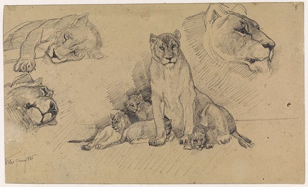 Johann Melchior Roos made this study of "Three Tiger Heads" with red chalk on paper in the late 17th or early 18th century. The quickness of Roos's chalk lines speaks to the drawing's function as a preparatory sketch for a larger painting, made with economical means. The grainy texture of the chalk adds depth to the tiger's fur, and the warm hue lends a sense of vitality to the subjects. Roos captures the essence of each tiger's distinct expression through subtle shifts in line and shading. This piece is a reminder that even seemingly simple materials can be imbued with sophistication. It elevates the status of drawing as a mode of creative exploration. By considering the context of its creation and the artist's engagement with his medium, we gain a deeper appreciation for the skill and vision behind this study.