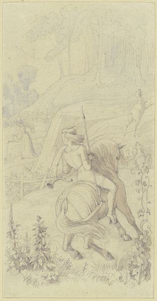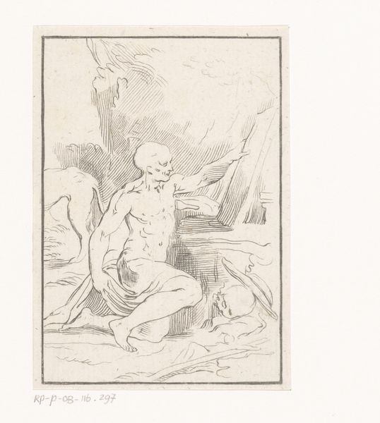 Curator: Let's take a moment with this etching entitled “Two Boys with a Marmot,” created by Carlo Domenico Melini, sometime between 1750 and 1795. What springs to mind for you? Editor: Whimsy, absolutely! There's something endearingly peculiar about the whole scene. The delicate line work almost tickles, you know? It’s a rustic charm with this baroque backdrop. I wonder, what's the story? Curator: Genre scenes were very fashionable, so probably a bit of harmless social commentary on the working class, a brief pause to marvel at simplicity. You'll notice Melini renders the landscape with considerable care, that towering tree… rooted tradition. It anchors the piece, a kind of eternal witness to fleeting human encounters. Editor: Oh, you're right. The tree *is* stoic! And what about the marmot itself? Animals always carry such baggage... Curator: Precisely! The marmot, for me, embodies that strange mix of wildness and domesticity. It’s a captured creature, yet it stands tall, almost comically defiant with a pickaxe. The tool might indicate work, the burden they’re trapped in. Melini may also subtly point toward labor as natural. After all, that creature isn’t out of place to till the soil like that… It hints at the period's evolving attitudes towards nature and its relationship to man, doesn't it? Editor: It does! It's making me think about the human tendency to project ourselves onto animals… this marmot mirroring human work ethics and responsibilities. So melancholic, to see yourself caged in nature. Even the boy's interaction seems strained and awkward as though there are societal expectations. I hadn’t caught the baroque until now. Curator: It's a subtle layer. While we might easily classify the work within genre-painting with that working-class trope, there’s drama infused from the etching style itself; very exaggerated and detailed for such humble folk. I feel it captures a sentimental glimpse into a world grappling with new ways of seeing itself and its place within a quickly evolving society. Editor: Absolutely, it is as though they're captured between two ages... an anxious precipice for the whole picture. Well, Melini has certainly sparked some intriguing questions for me. Thanks!