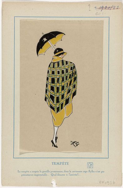Editor: Here we have "Très Parisien, février 1922: 3.- PRUNELLE," a drawing from 1922, housed in the Rijksmuseum. It depicts a woman in a strikingly patterned purple dress, a definite Art Deco feel. I find the drawing elegant, but the dress also seems almost like a uniform. What strikes you most about this piece? Curator: I’m immediately drawn to the textile. Look at the implied labor in producing such a patterned fabric – someone designed it, someone wove it, someone printed it. Consider the social context: it's 1922, post-war. This isn't just fashion; it represents a particular kind of industry and consumption available to Parisian women of a certain class. The print's materiality suggests ideas about femininity and leisure, what kind of bodies and lifestyles can afford that visual spectacle? Editor: So you're focusing on the means of production. Does the relatively simple style of the drawing itself—the medium— play a part in that, given it presents a highly crafted output? Curator: Exactly. The seemingly effortless lines belie the intensive material process they represent. This is an image circulating as advertisement. How many women have direct access to these dresses, how many will seek similar styles mass-produced through mechanized, perhaps exploitative means? And what is the status of a drawing: advertising, fashion plate, commodity? Editor: That gives me a lot to think about. I was initially drawn to the aesthetic, but understanding the materiality really transforms my perception. Curator: Seeing art as connected to the larger social systems changes our relationship to the aesthetic experience. Thanks to this connection we find the importance in how we make, not just what is being represented.