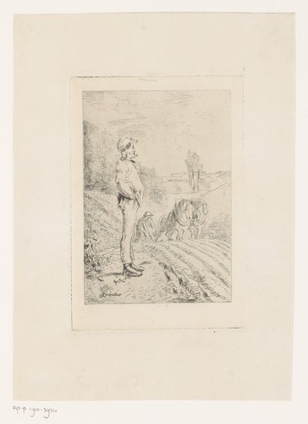 Curator: Here we have Jean Théodore Joseph Linnig’s etching, "Man Leaning Against a Wooden Fence," created around 1885. It’s a genre scene rendered with striking detail. Editor: It's mostly tones of light grey, very atmospheric. The figure has his back to us. The hat is a little floppy, adding a bit of visual levity against the otherwise somber mood of the image. Curator: I agree. I find the use of etching particularly relevant. This process, using acid to corrode lines into a metal plate, would have been a labor-intensive method accessible to artists of varied economic means, reflecting Linnig’s social observations of the period. Editor: Right. And look at the etching technique here: See the visible cross-hatching used to create depth, specifically in the figure's clothing, adding a certain density to the materiality and presence of the figure that contradicts the almost hazy landscape behind. Curator: Precisely. One might see the wooden fence as a symbolic class division, but even more specifically it functions as part of the industrial-agricultural context for many 19th-century rural dwellers in Europe. The division of land, and of labor… Editor: …while it certainly represents societal structure, the fence offers him support, physically and perhaps symbolically, inviting a momentary pause for contemplation. The subtle windmills and village buildings in the background pull our view far past the fence line creating a multi-layered spatial composition. Curator: Yes, that perspective is carefully rendered. But to consider its process, one could argue that such prints democratized art ownership for the rising bourgeois class by presenting idealized representations of labor and rural life they found attractive for the walls of their homes. Editor: It’s an interesting commentary. Still, as I step back, I appreciate the delicate tonal qualities as part of its appeal; they add significantly to its mood. Curator: Indeed, understanding its historical placement helps clarify how Linnig engaged with the artistic debates of his era. Editor: Looking at it from a purely aesthetic standpoint I am more drawn to the interplay of darkness and light to suggest feeling. Curator: Both of those approaches combined makes the appreciation richer I would suggest.
