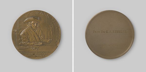 Curator: This commemorative medal, dating back to 1845, honors L.J. Dermout’s thirty years as secretary of the General Synod of the Dutch Reformed Church. The piece, attributed to Johannes Petrus Schouberg, is crafted in bronze. Editor: It strikes me as surprisingly modern in its simplicity. There’s a stillness, a solemnity, that radiates from the portrait, even in this small, circular form. Curator: Indeed. The profile is very precisely rendered. On the obverse, the inscription that encircles his likeness translates, more or less, to “in honor of” his long service. Medals like these served as public affirmations, tangible tokens of esteem within societal structures. Editor: The lettering on the reverse feels like a deliberate echo of classical inscriptions, reinforcing the sense of tradition and the enduring importance of the Church. How fascinating to see the use of bronze, a material associated with permanence, employed for this commemoration. It gives the piece a sense of weight beyond its physical dimensions. Curator: The symbolism of circular forms is not lost either. Representing wholeness and continuity. Also note that portraiture, especially in relief, was historically used to convey authority and status, rooting individuals in the broader historical narrative. What kind of emotions do you think such a medal could trigger at the time, in particular circles? Editor: Likely a mix of pride and belonging within the Dutch Reformed community. The medal creates and reaffirms an inner group and a sense of cultural identity, doesn’t it? This was probably not just an image, but a social act. A carefully constructed narrative presented through a physical object. Curator: Absolutely, a social act solidified in metal. Thinking about what resonates, for me, it’s how this single medal embodies a specific time and place in Dutch history. Editor: And for me, it underscores how societies memorialize figures—the enduring power of a simple, precisely rendered image.