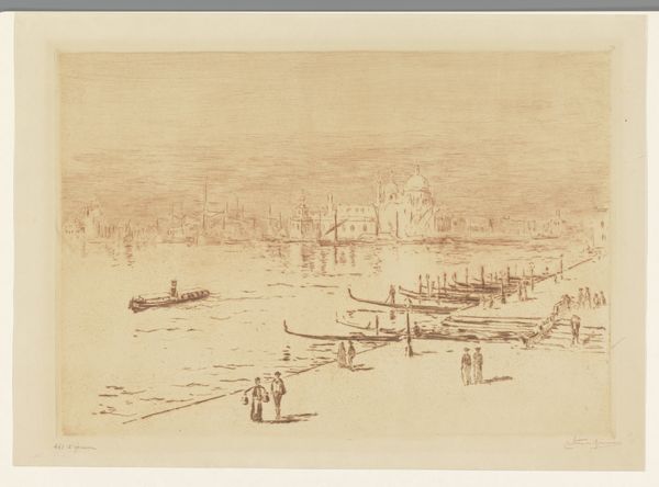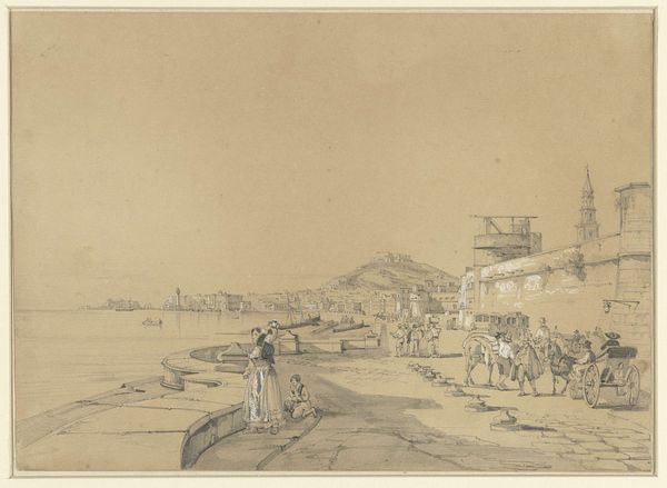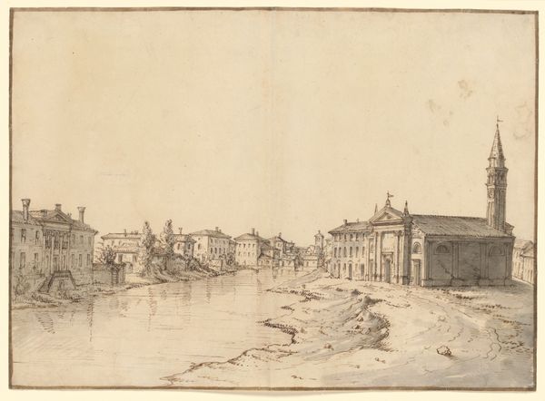 Editor: This drawing, titled "Sacca della Misericordia" by Francesco Guardi, employs chalk, ink, and watercolor to depict a cityscape. The somber, sepia tones create a muted effect... What historical narratives do you see woven into this piece? Curator: It’s fascinating how Guardi captures Venice, not just as a beautiful cityscape, but as a site of labor and movement. The boats aren't simply picturesque; they're conveying goods and people. Consider how the waterfront, traditionally a space of connection and commerce, might have been experienced differently across social classes and genders at that time. How do you think Guardi’s own social position may have influenced his choice to focus on the everyday aspects of Venetian life? Editor: I hadn’t considered that. I guess I saw it more as an idyllic scene. You're saying we should question whose Venice is being represented here? Curator: Exactly! It’s important to remember Venice's complex social hierarchies. Think about the role of marginalized communities, the invisible labor that kept the city functioning. While Guardi's technique is undeniably masterful, we should also consider whose stories are absent from this idyllic view. Does focusing on labor change the emotional impact for you? Editor: Definitely. Knowing that gives the scene a sense of grounded reality and prompts reflection on the full picture of Venetian society, not just a surface-level image of beauty. Curator: Precisely. By understanding the socio-political contexts, we can engage with art in a more nuanced, critical, and ultimately more meaningful way. Editor: I now realize there are many layers to discover within such a seemingly simple cityscape.