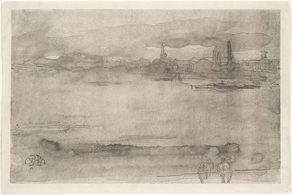 Curator: It’s all about suggestion, isn’t it? Like a half-remembered dream clinging to the air. That’s my immediate response to Whistler’s 1878 pencil drawing, “Early Morning.” What's grabbing you about it? Editor: Immediately, the dominance of mist! That and how the faint cityscape seems more ghostly apparition than solid London buildings. It begs the question, who was this artwork meant for? Who did he imagine viewing it? Curator: Precisely! He wanted to evoke a feeling more than document a scene. This wasn't for the masses. Whistler actively cultivated a sophisticated, "art for art's sake" viewership, and drawings like this catered perfectly to that aesthetic. The near-monochrome palette, that ethereal quality – it invites quiet contemplation. Editor: Absolutely. There is a social element here. This drawing represents an era of immense social change in London, fueled by industrial expansion, urbanization, and also wealth accumulation and glaring income inequality. Curator: He sort of skims over those social upheavals, doesn’t he? It’s almost like he is airbrushing those complexities from view. He seems more drawn, forgive the pun, to the effects of the new city than its raw energy or its darker sides. It’s romantic and stylized – almost theatrical, like a set design. Editor: Well, that ties into his larger aesthetic project. Whistler positioned himself as a sensitive observer refining visual culture for elites while filtering the impacts of social inequalities and material change. Look at the faint figures in the foreground, anonymous, their roles uncertain, and how that ambiguity also reinforces the sense of dreamy disconnection. Curator: Perhaps he captured the feeling of urban alienation that some people experienced even then – or maybe just my personal sense of not knowing quite how to 'belong'! Regardless, I keep coming back to its almost Japanese quality of simplicity and carefully considered placement. Editor: Exactly! "Early Morning" isn't just a pretty picture. It is a political statement. It offers a lens into how artistic practices shape understandings of urban change. I'm struck by how seemingly 'unpolitical' art can carry such potent social narratives. Curator: And for me it suggests what can be found in looking deeper for yourself within those changing contexts.