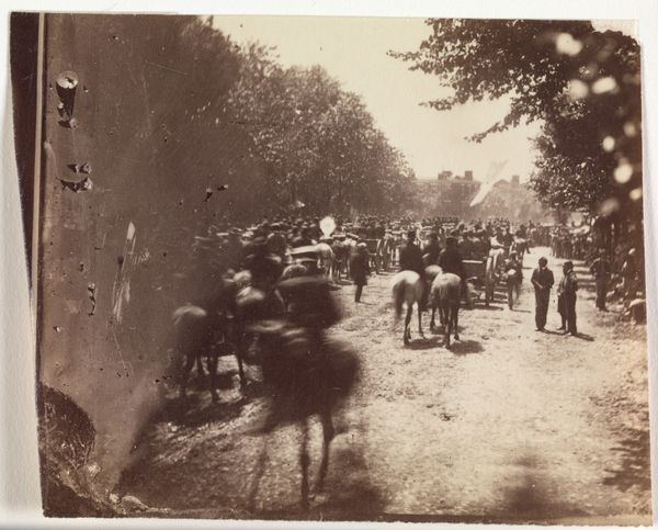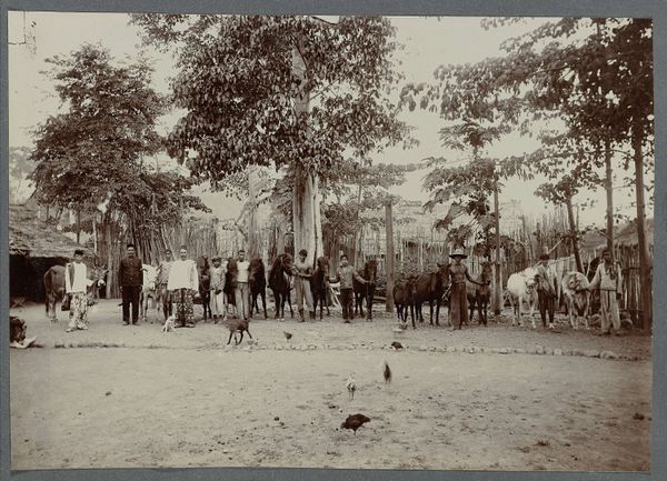 Editor: This gelatin-silver print is titled "Straatgezicht op de pasar in Jogjakarta," taken between 1890 and 1900 by Kassian Céphas. It feels incredibly documentary, like a frozen moment of everyday life. What do you see when you look at this image? Curator: I'm struck by the composition and the gradations of light. Notice how the receding lines of the street draw the eye into the distance, creating depth. Also observe the placement of figures; they are not randomly scattered, but form rhythmic patterns that complement the architectural elements. Editor: Rhythmic patterns? I hadn't thought of it that way. Could you explain further? Curator: Certainly. Consider the repetition of shapes: the thatched roofs, the figures carrying goods, and even the trees. These create a visual cadence. The differing tones, ranging from near blacks to cloudy whites, is evidence of the gelatin-silver process, providing this texture. Editor: So, you're saying that the photographer’s intentional arrangement is key here? Even in what appears to be a candid street scene? Curator: Precisely. Though presented as documentation, choices in composition, lighting, and focus reveal artistry beyond mere record-keeping. It raises questions about the very nature of photography, and how even seemingly objective depictions involve careful structuring. Editor: It’s interesting how the constraints of the photographic materials and technology shape our perception. Curator: Indeed, and influence the photographer’s approach, framing our perception. Editor: That makes me see the photo in a completely different way. I was so focused on the people, but the composition is fascinating. Curator: It's a fruitful reminder to analyze the elements that constitute what appears to be simple photographic reproduction, rather than be simply drawn in by what the representation depicts.