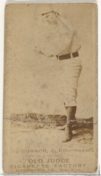 Curator: Here we have an intriguing artifact: a baseball card from the "Old Judge" series, circa 1888, featuring Farrell, a second baseman for the Baltimore Orioles. These were produced by Goodwin & Company, a cigarette manufacturer. Editor: There's something wonderfully evocative about the sepia tones. Farrell is caught in a mid-throw pose, gazing upwards, perhaps tracking the ball? It speaks to the fleeting nature of action, frozen in time. Curator: Yes, the photograph itself is quite remarkable considering the era. But consider the function of this card. It wasn't just about capturing an image. It was about creating a commodity, embedding Farrell’s likeness into the very fabric of consumer culture, alongside tobacco production. Editor: The iconography here is fascinating. The idealized athlete, elevated. Look at how the viewer is encouraged to literally look up to Farrell, making the simple act of admiring this player complicit with admiring "Old Judge" cigarettes. Curator: Precisely. The material dimensions also influence the artistic reading: consider how mass production affects perceptions of value and celebrity. These weren't unique artworks; they were churned out to promote consumption, to circulate representations of fame, of sport, to push product. Editor: And consider the symbolism attached to baseball itself. In 1888, baseball was emerging as a national pastime, embodying ideals of athleticism, teamwork, and American identity. This card connects Farrell to those potent ideas and associations. The very act of possessing his image could create a feeling of social integration and solidarity. Curator: We can see then the image, the production of it, is all feeding into this machine. The consumption and ritual attached to the everyday object is embedded with ideologies surrounding sport and consumerism. Editor: Examining this small artifact gives such insights. We can easily reflect how we create hero-like figures. To reflect how celebrity functions for us today in a world full of media.