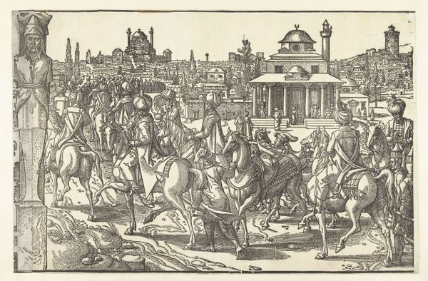 Curator: This engraving by Romeyn de Hooghe, held at the Harvard Art Museums, depicts the triumphal celebrations in Paris for Alessandro Farnese. Editor: It feels like controlled chaos, doesn’t it? So many figures densely packed, yet drawn with such precision. You sense the weight of expectation and performance here. Curator: Absolutely. Farnese was celebrated for breaking the blockade, becoming a symbol of power and victory against perceived enemies of the state. Note the triumphal arch, almost a stage for the procession. Editor: Right, and considering the historical context, it's impossible to ignore the politics embedded in this image. The celebration itself is a statement, a reinforcement of power structures amid ongoing conflicts. It is also an amazing demonstration of the power of propaganda. Curator: True. The artist masterfully used symbols of Roman triumph to cast Farnese in a heroic light. It reinforced the notion of a divinely sanctioned leadership. Editor: It makes you wonder, who was this image really for? What message did the ruling class want to convey, and what was the cost to those outside this frame? Curator: The print certainly invites us to consider the spectacle of power and its enduring influence. Editor: Indeed. It's a reminder that images are never neutral; they're always part of a larger, ongoing conversation.