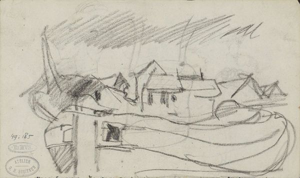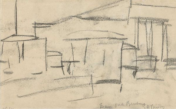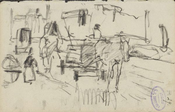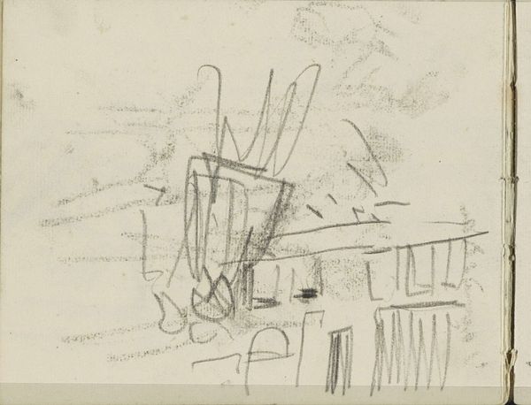 Curator: Here we have a work by George Hendrik Breitner, a pencil drawing from 1895 titled "Landschap, mogelijk met bunkers," which translates to "Landscape, possibly with bunkers." It's part of the Rijksmuseum's collection. Editor: It has such an immediate, unfinished quality. A bleakness too. The almost scribbled lines hint at some stark industrial forms but lack definition and blend with naturalistic ones. Curator: Breitner was known for his interest in depicting modern, urban life and the working class. While famous as one of the group of Amsterdam Impressionists, this work comes across as almost brutally realistic, a visual response perhaps to the militarization of the landscape. Consider also the potential relationship between such fortification and Dutch national identity. Editor: Yes, because from my vantage point, it's also suggestive in the sense that its rawness almost mirrors the disruption of these bunker systems. But these structures become enmeshed with nature and human life—suggesting, almost, they might not even be separate at all. Do you think there’s some commentary embedded about environmental or societal degradation? Curator: It’s fascinating to see how easily we, viewing from our contemporary moment, read ideas about environmental disruption back into a piece from the late 19th century. It’s vital to remember that those social anxieties surrounding large scale building projects were often as much to do with nationalism, rapid social change, class divides, as about any developing sense of a modern ecological consciousness. It is such a fascinating study of this intersection of art, technology and early concepts of nation building. Editor: Perhaps, though for me that interplay really reflects on the complex nature of the artwork—that art doesn't necessarily depict "truth," but can explore a range of perspectives on it. Anyway, this drawing is an excellent glimpse into the intersection of art and politics. Curator: Indeed, seeing these rudimentary beginnings as part of a bigger societal picture opens new doors to understanding visual culture. Editor: Absolutely. There’s such powerful potential locked within early renderings that it almost eclipses any supposed completed work!