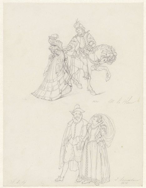 Curator: Welcome to this study for a mural by Antoon Derkinderen, titled "Design for a Mural in the Beurs van Berlage: Entry of the Three Maidens Activity, Sociability, and Wisdom, Behind a Rock Mercury," created between about 1869 and 1925. Editor: My initial thought is that the subtle pencil work almost romanticizes labor; the textures and tonalities grant them this ethereal weight, no? Curator: The ethereal quality definitely stands out. Look at the precise linework used to define the figures, emphasizing an idealized representation through classic academic techniques. This aligns with the aspiration to ennoble civic values—the qualities of industry embodied by these maiden figures, emerging behind Mercury. Editor: How much of the "labor" element is down to the literal labour put in to producing the work? I'm interested in the contrast between the artistic rendering and the values it’s supposed to celebrate. Also, pencil, especially graphite at the time, leaves its own mark. There’s the smooth application to the faces but these light scratchy marks around the flowing robes. Curator: Precisely. The pencil medium, with its capacity for nuanced detail and shading, serves not merely as a preparatory tool but as an integral component of the aesthetic impact. Editor: Absolutely! These pencil sketches expose how labor is glorified but removed from real labor... which is an intrinsic contradiction within the work itself. How does that contradiction fit into the function of Berlage as an active stock exchange building and, basically, as a place for capitalists? Curator: Derkinderen subtly mediates, by adopting an allegorical vocabulary rooted in tradition yet hinting at a modern ethos of progress, which echoes both the classic themes and changing realities within a modernized economy. Editor: Thank you, I can appreciate the work with new insights on process and materiality that frame historical labor, not as just figures to glorify capitalism, but instead the artist and laborer coming together! Curator: It reveals layers within this fascinating synthesis, so viewers understand Derkinderen as bridging traditions.