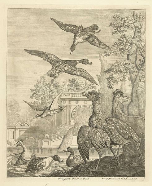 Editor: Here we have "Mantelmeeuwen en eenden in een vogelvijver," or "Gulls and Ducks in a Bird Pond," a print by Peter Casteels III made sometime between 1708 and 1749. The stark black and white engraving really catches the eye. There's so much detail packed into this image, it's almost overwhelming. What do you see in this piece? Curator: From a formalist perspective, the linear precision achieved through the engraving process defines this piece. Notice the meticulous rendering of each feather, each ripple in the water. It’s the visual interplay of textures—the smooth, reflective water against the rough foliage—that creates the dynamism. Editor: It almost feels scientific, in a way. Like a catalogue of different bird species. Curator: Precisely. Observe how the composition is structured. Casteels uses the horizontal line of the pond's edge to divide the image, grounding the avian activity in the lower register while allowing the upper portion to convey movement and lightness through the flying birds. Note the architectural structure in the background; what function does it perform? Editor: It adds a sense of order, maybe? Everything else feels so natural and wild. It’s interesting how the birds closer to us are so detailed, but the building kind of fades into the background. Curator: Indeed, that deliberate contrast highlights the birds' physicality. We must also consider the artist’s skillful employment of perspective, creating a sense of depth within the image through relative scale and meticulous hatching techniques. Casteels has manipulated light to guide the viewer’s eye through the tableau. Editor: So it’s less about what the birds *are* and more about *how* they are represented? Curator: Yes, this analytical lens illuminates the intentional orchestration of form and line that define Casteels' artistic voice and underscores the power of semiotics, to reveal a meaning of lines within the space depicted. Editor: I'm starting to see how much the technical choices shape our experience of the image. I thought it was just a picture of birds, but it’s so much more deliberate than that. Curator: Absolutely. Art engages us not just through its subject, but through the very language of its creation.
