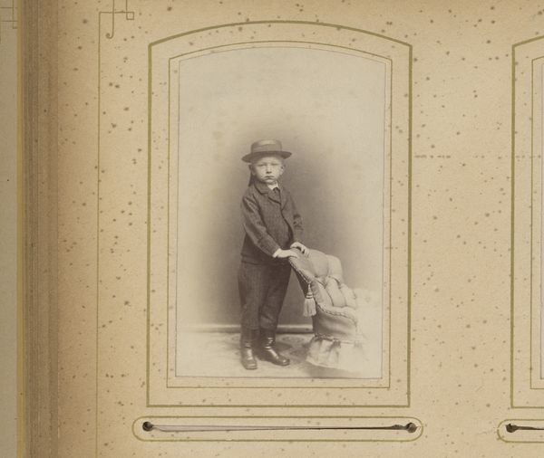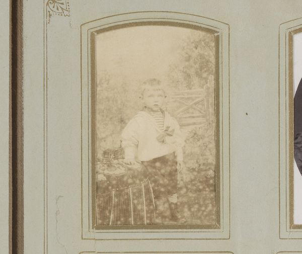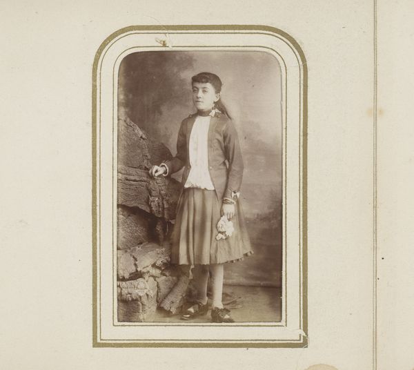 Editor: This is a portrait from somewhere between 1870 and 1900, titled 'Portret van een man met mes en pijp, mogelijk fotograaf Louis Martin,' made with the albumen print process. The man is striking-- sort of stern. He's holding a large knife or maybe a small sword and smoking a pipe. What's your take on this piece? Curator: The visual cues definitely speak to masculinity and status in the late 19th century. But what does it mean to stage oneself in this way, given photography’s relatively new role? Does this image uphold or challenge the era’s rigid codes of gender and class? Think about it: a "man with a knife" -- that reads one way; however, when paired with the possible profession of "photographer", does the meaning shift, opening up new avenues to consider Martin's identity, his chosen posture, and how this work addresses issues related to social representation? Editor: I guess I hadn’t thought about it that way. Maybe it’s not so much about proving something as performing a role... like on a stage? Curator: Precisely. The photograph as a tool for constructing identity, performing it, even subverting expectations. Who gets to control the narrative? Is this simply a commercial transaction with the sitter requesting a standard pose or does the photographer exert their own authorial intent in relation to prevailing societal norms of the time? Editor: So, while it seems simple on the surface, the photograph sparks a conversation about identity, performance, and the control of one's image. I guess I walked into this with a set of preconceived notions about "masculinity," and completely missed the deeper social issues involved! Curator: Exactly! We have to consider images as products of their time. Always interrogate the visual, the social, and the historical contexts together. This way of engaging provides valuable insight not just for photographic portraits but all images from that period, revealing not only the social milieu in which images were made, but the biases that continue to perpetuate narratives surrounding gender and representation today.