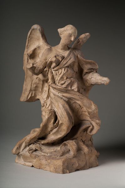Editor: So this is Giuseppe Gori’s "Angel," likely crafted sometime in the late 18th century. The detail is captivating! It feels both heavenly and somehow…earthy? How do you interpret this work? Curator: Ah, yes. Isn’t she sublime? She almost feels as if she could float off of the plinth. When I see this "Angel", I sense a yearning for lightness. Notice how Gori combines sculpture with actual fabric! A clever wink to both permanence and the transient nature of, well, just about everything. What about the color palette? Does that conjure anything for you? Editor: I see pale pinks and greens – almost pastel, soft and calming... unlike some Baroque art, which can feel so grandiose! Curator: Exactly! It steers clear of heavy gold leaf, right? Gori's piece hints at a shift happening at the time – away from the ostentatious display of wealth toward, shall we say, a more delicate, thoughtful spirit. Consider her earthly tones against the possibility of ascendance. I always wonder if she's thinking of flying *away* or settling *down.* What do *you* think? Editor: That's really interesting, I hadn't considered it that way! Perhaps it’s less about Baroque display and more about…Baroque pondering? Curator: Precisely! It's that whisper of introspection amidst all the ornamentation. Lovely, isn't it? A small rebellion, softly delivered, and that’s a sentiment I can embrace. Editor: Absolutely! Thanks. Now, I won’t just see a pretty sculpture, I’ll also appreciate its historical subtleties.