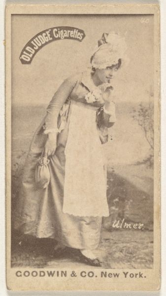 Curator: Let's discuss "Card Number 76, Ida Mulle and Guenn (?), from the Actors and Actresses series," a piece created in the 1880s by W. Duke, Sons & Co. This is a photographic print that was originally issued as a promotional item for Cross Cut Cigarettes. Editor: It's a touching, if a little unsettling image. There's a fragility in the two figures; one’s casual embrace, the other’s hesitancy. It gives a feeling of the delicate, brief encounter. Curator: It’s interesting that you pick up on that feeling of brief encounter. Tobacco cards such as these were immensely popular in the late 19th century and reflect the celebrity culture that was beginning to emerge, especially for actresses and performers. Consider the rapid distribution of images of women—often associated with theatre and the “new woman”—and the social anxieties they evoked at the time. Editor: The women are not overtly sexualized. The aprons are quite striking—as these visual cues relate directly back to ideas of idealized domesticity. It brings to mind ideas of performativity, of “playing” a specific gendered role in American society. What is being sold here? Tobacco, sure. But also? Images. Ideals. Status. Curator: Exactly! This particular card, preserved at the Metropolitan Museum of Art, speaks volumes about how advertising intertwined with cultural representations of femininity, performance, and even class during the late 19th century. Think of the broader debates about the visibility and mobility of women that were playing out in this period. Editor: The visual language definitely constructs an approachable ideal: "buy these cigarettes, achieve an aspirational lifestyle like these stars.” Their slightly melancholy appearance is almost an acknowledgment that even fame doesn't solve inherent societal concerns, yet hints they use cigarettes to perhaps cope? Curator: It’s a compelling interplay between commercial promotion and a burgeoning celebrity culture. Consider it as a small, powerful artifact revealing anxieties around gender identity in a rapidly modernizing society. Editor: Seeing how our perspectives differ yet align on its symbolism highlights just how multilayered what we think is simply an old advertisement really is. Thanks! Curator: Indeed! A window into history, condensed into the space of a cigarette card. A complex image!